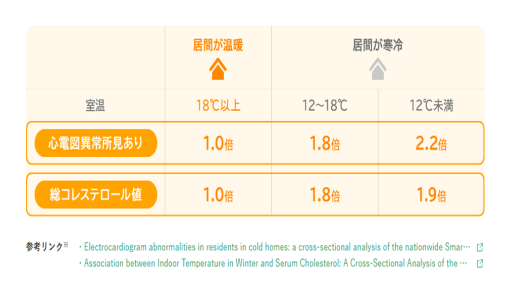 室温(18℃以上、12~18℃、12℃未満)で比較した場合、健康診断にも差がでたそうで、室温が12℃~18℃、12℃未満の住宅に住む人は、18℃以上の住宅に住む人に比べて