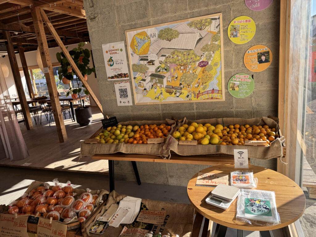 店内は旬の食材が色とりどりに並べられ、新鮮なフルーツをその場で購入できるようになっています。