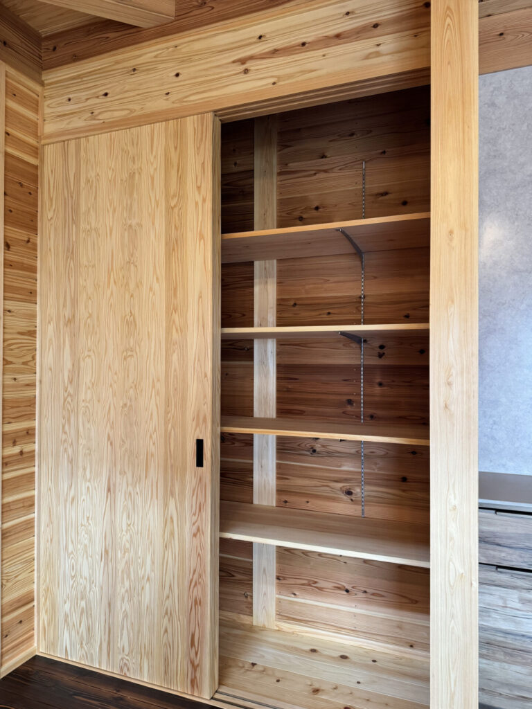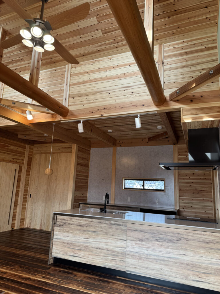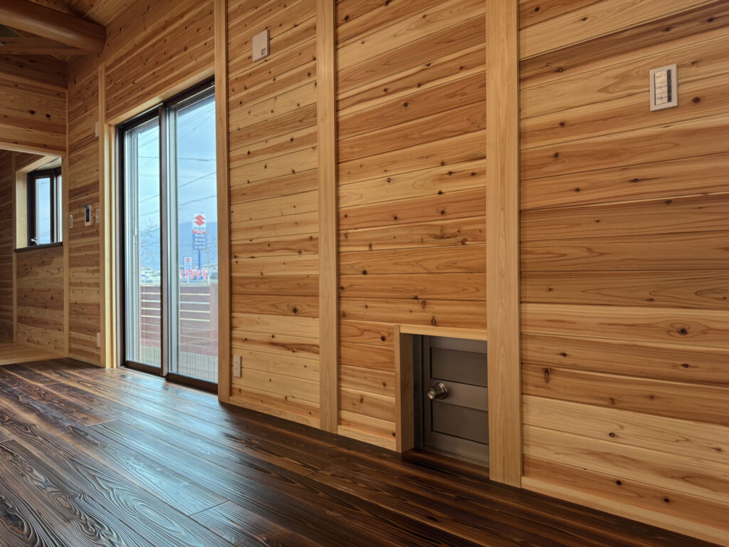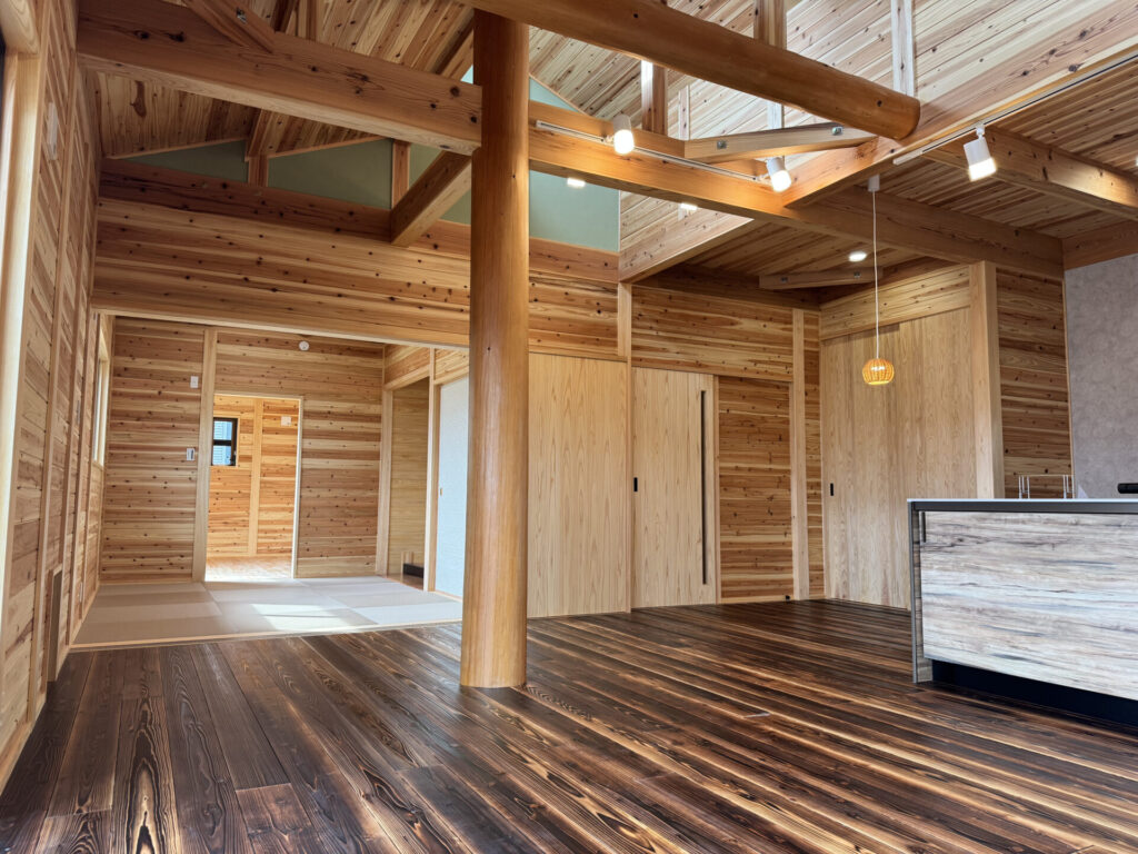 このお家は、壁の内側に真壁工法を採用し、自然木の無垢材をふんだんに使用することで、居心地の良さと美しさを両立させています。