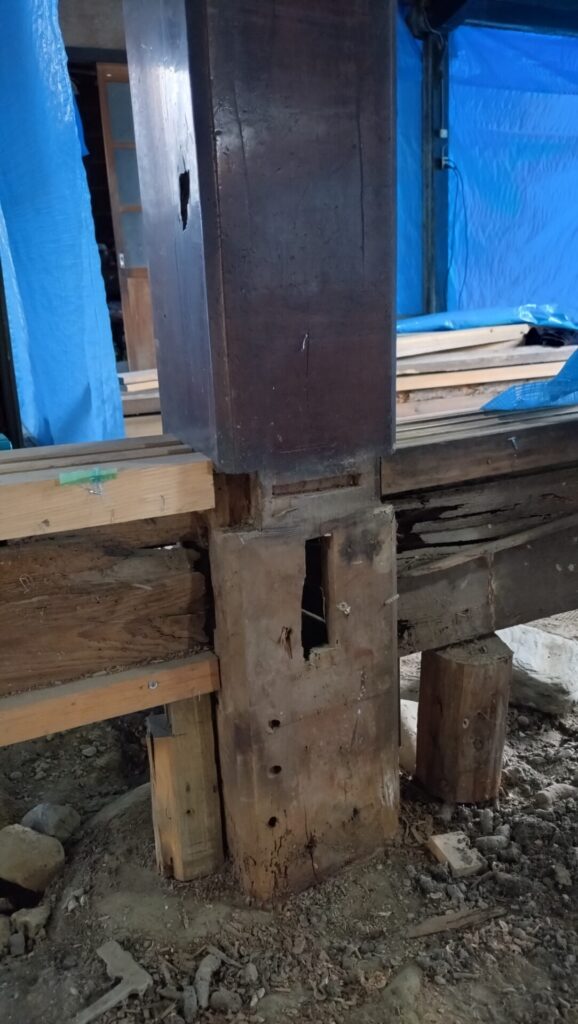 1本1本確認を行いましたが大黒柱の足元がシロアリの被害にあい、