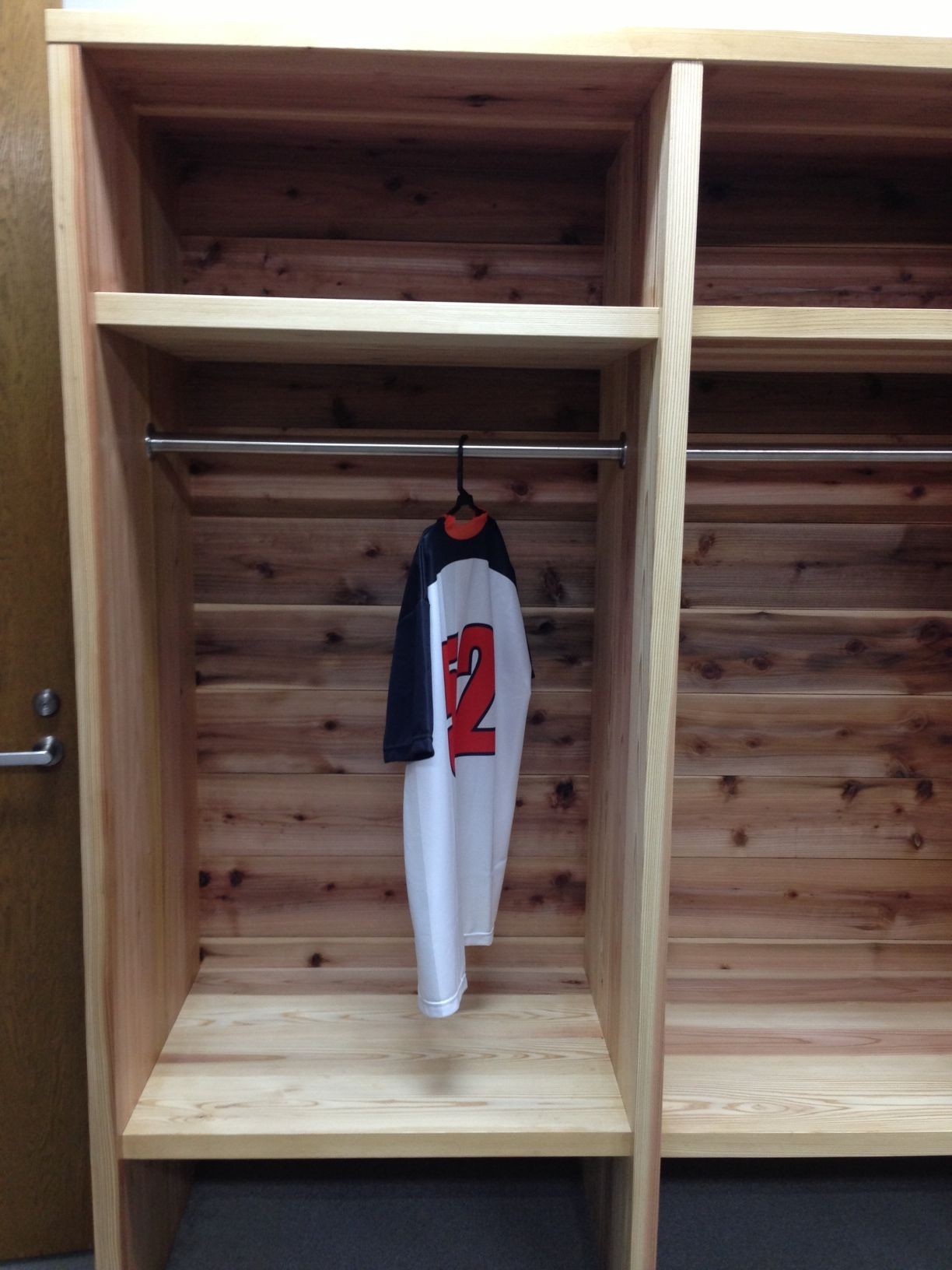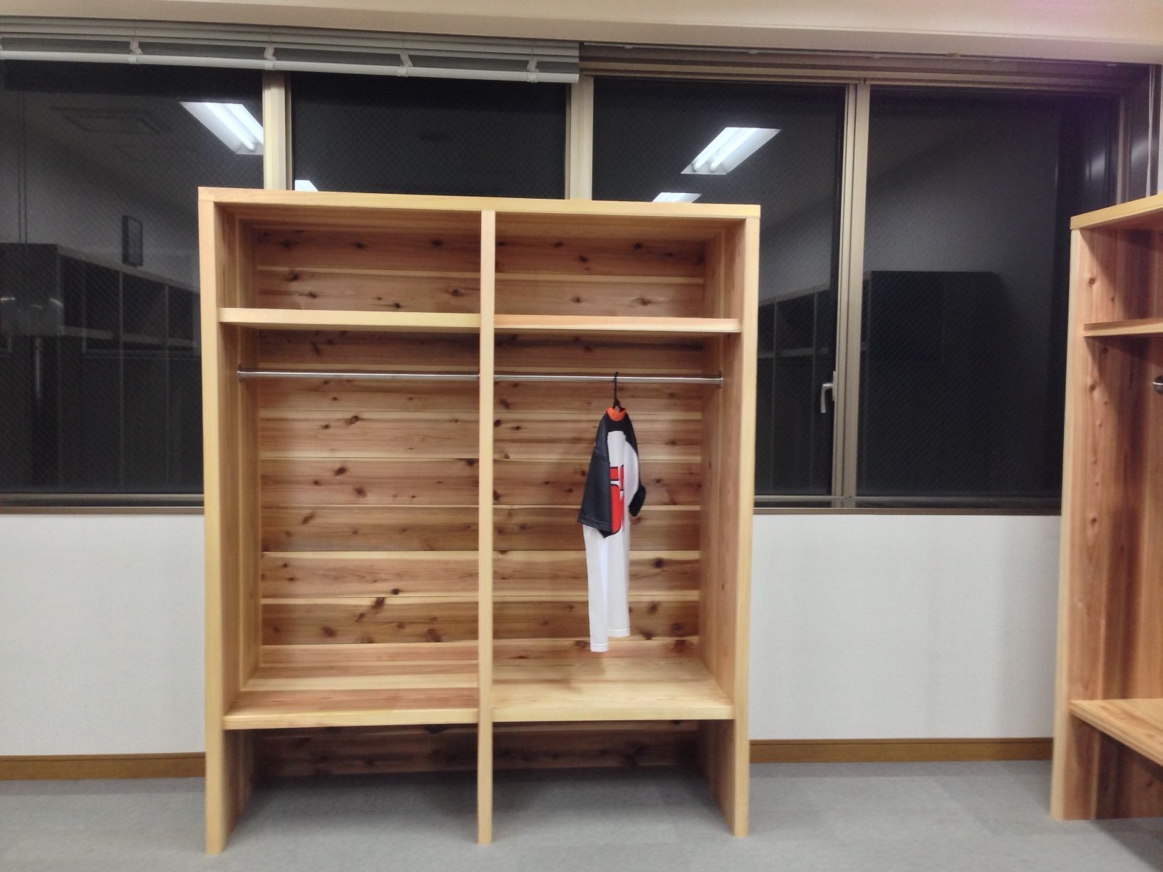 スポーツ施設の選手ロッカールームを設計・施工させて頂きました。 紀州材の杉・桧をふんだんに使用しています! 住宅建築現場の中で家具を設計するように、搬入経路なども想定し設計しています。