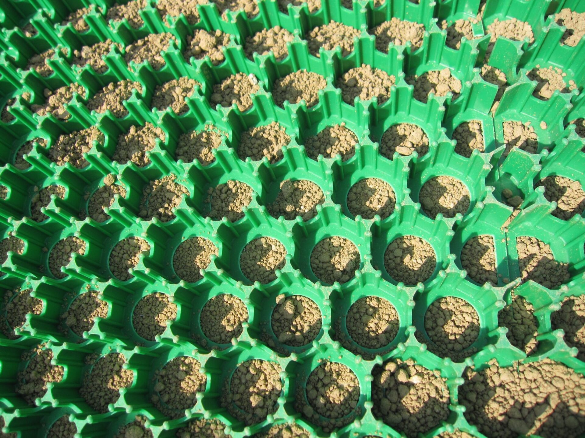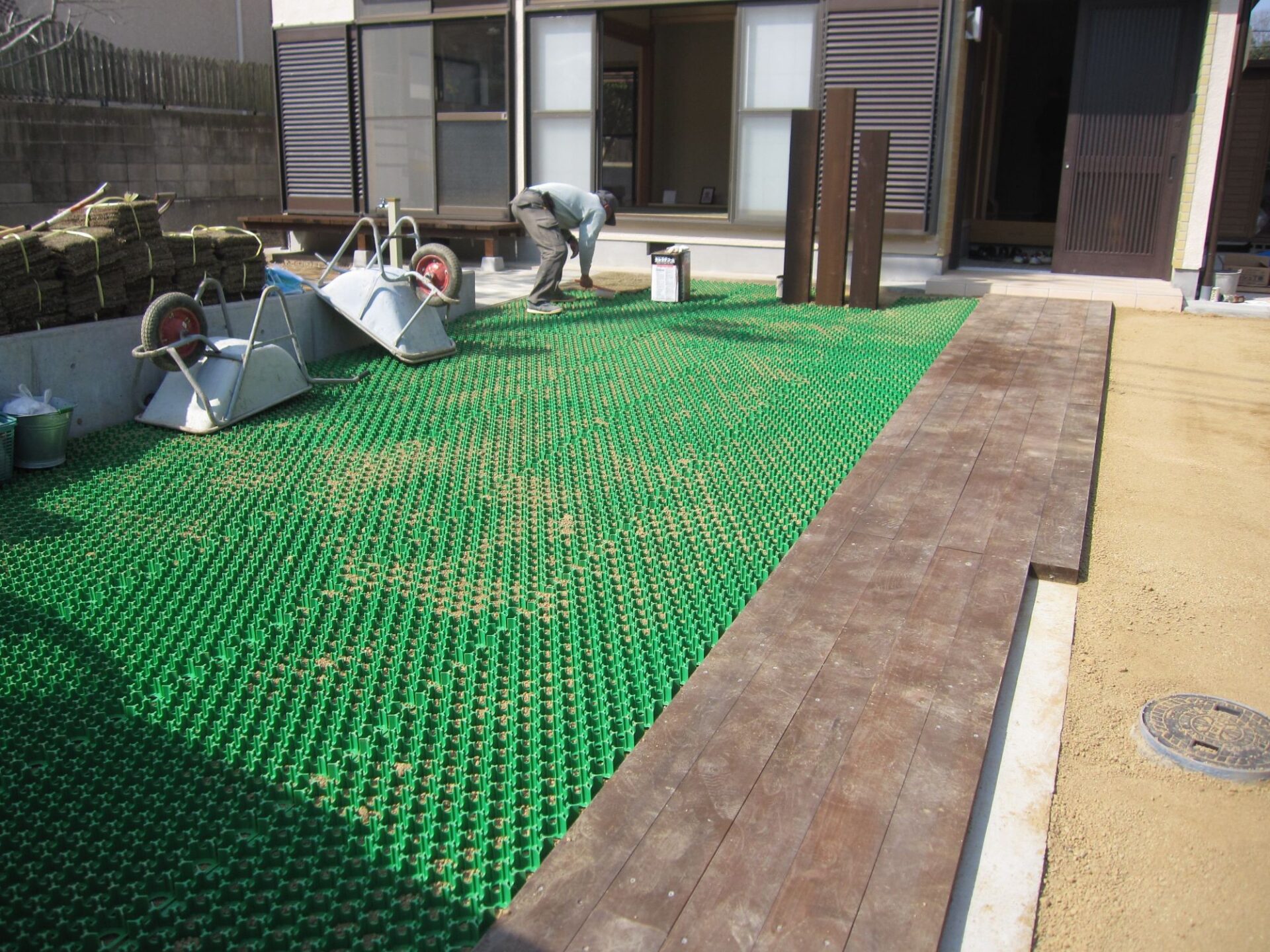 車の荷重から芝生を守る施工方法です。緑化をしながら駐車場としても利用でき、一石二鳥ですね。
