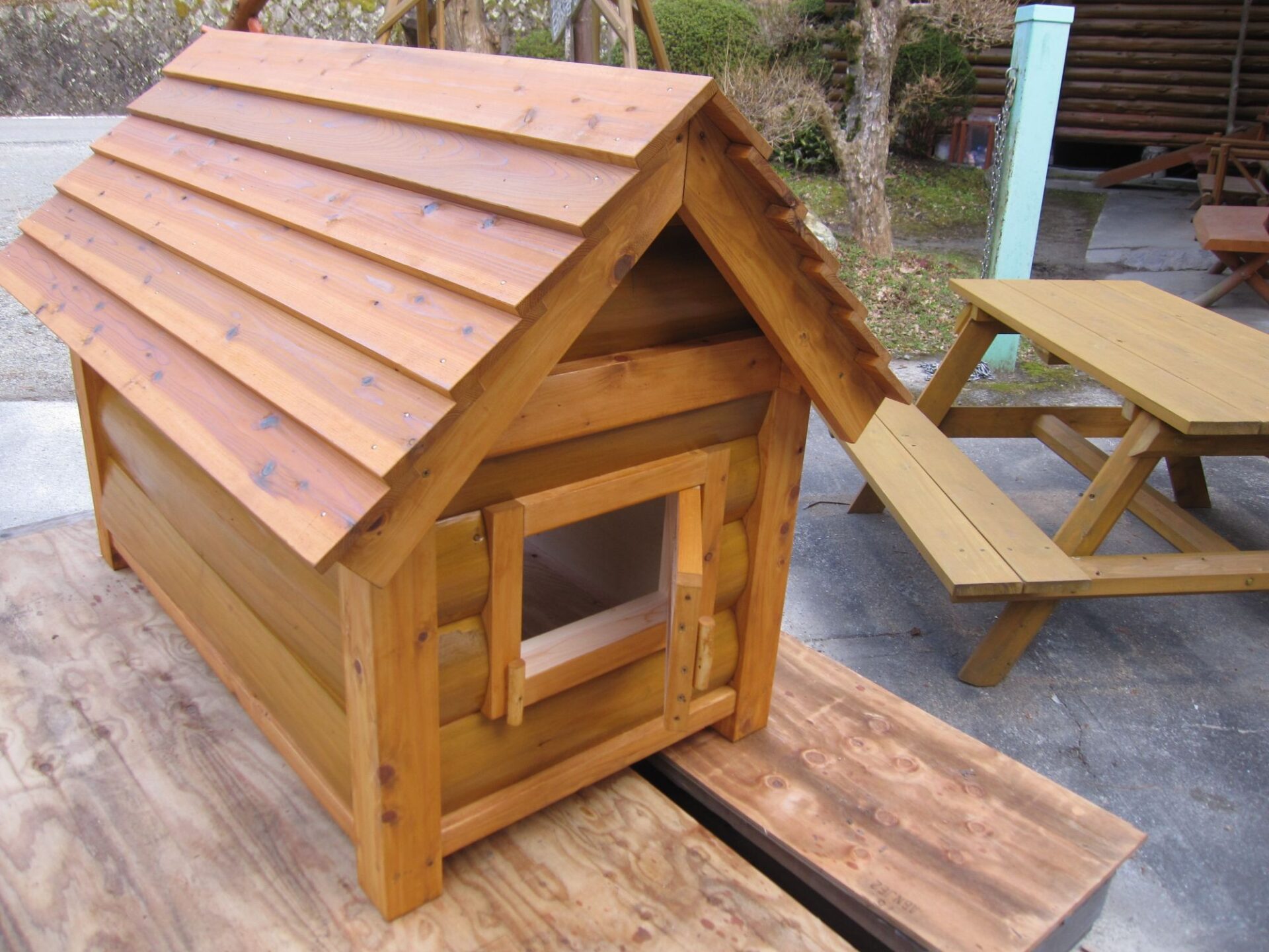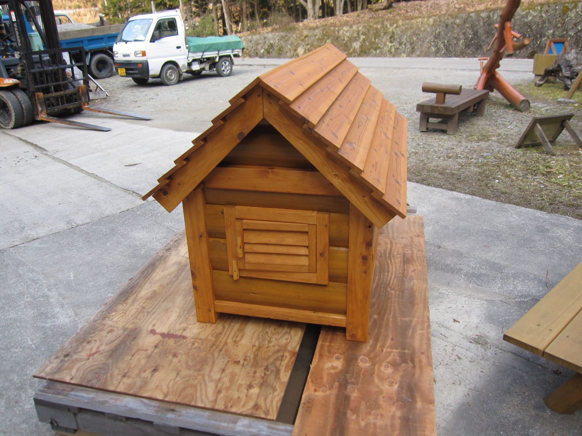 新築OBのお客様から 猟犬の犬小屋のご依頼を頂き 建てさせて頂きました! 出入口とは反対方向に小窓を設け風通しを良くしています。 段葺きにした屋根がより立体感を持たせます。