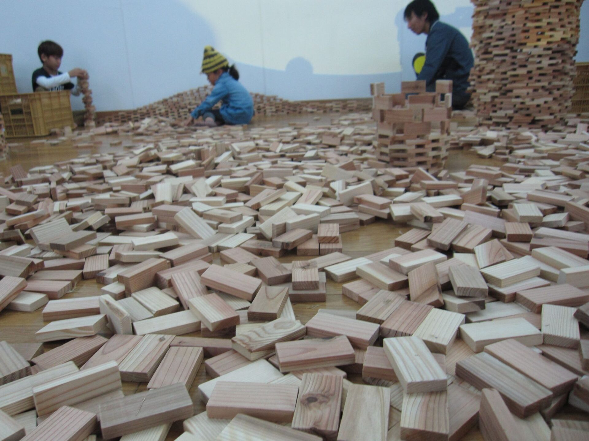 当社では建築端材や工場内ででる端材を利用して、紀州材の積木を作っています。おもちゃ屋さんで売っている積木のようにまっすぐではありませんが、少しでも多くの方に木にふれて頂けるように、積木2万ピースをご用意させて頂き、イベントに持ち込ませて頂いております。老若男女が夢中になります。