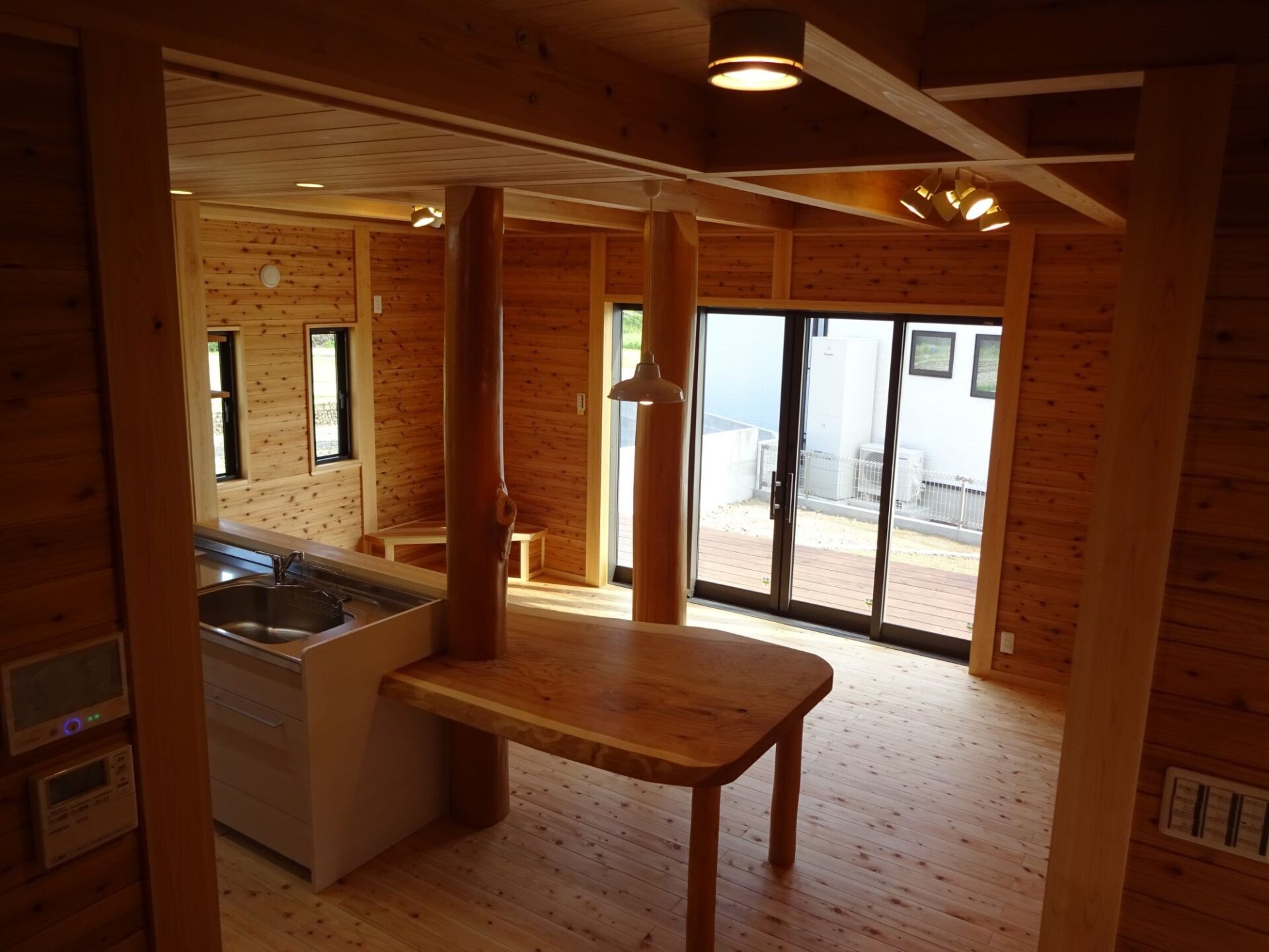 作り付けのカンターテーブルのあるLDKから、テラスも同じ空間として使えるように。