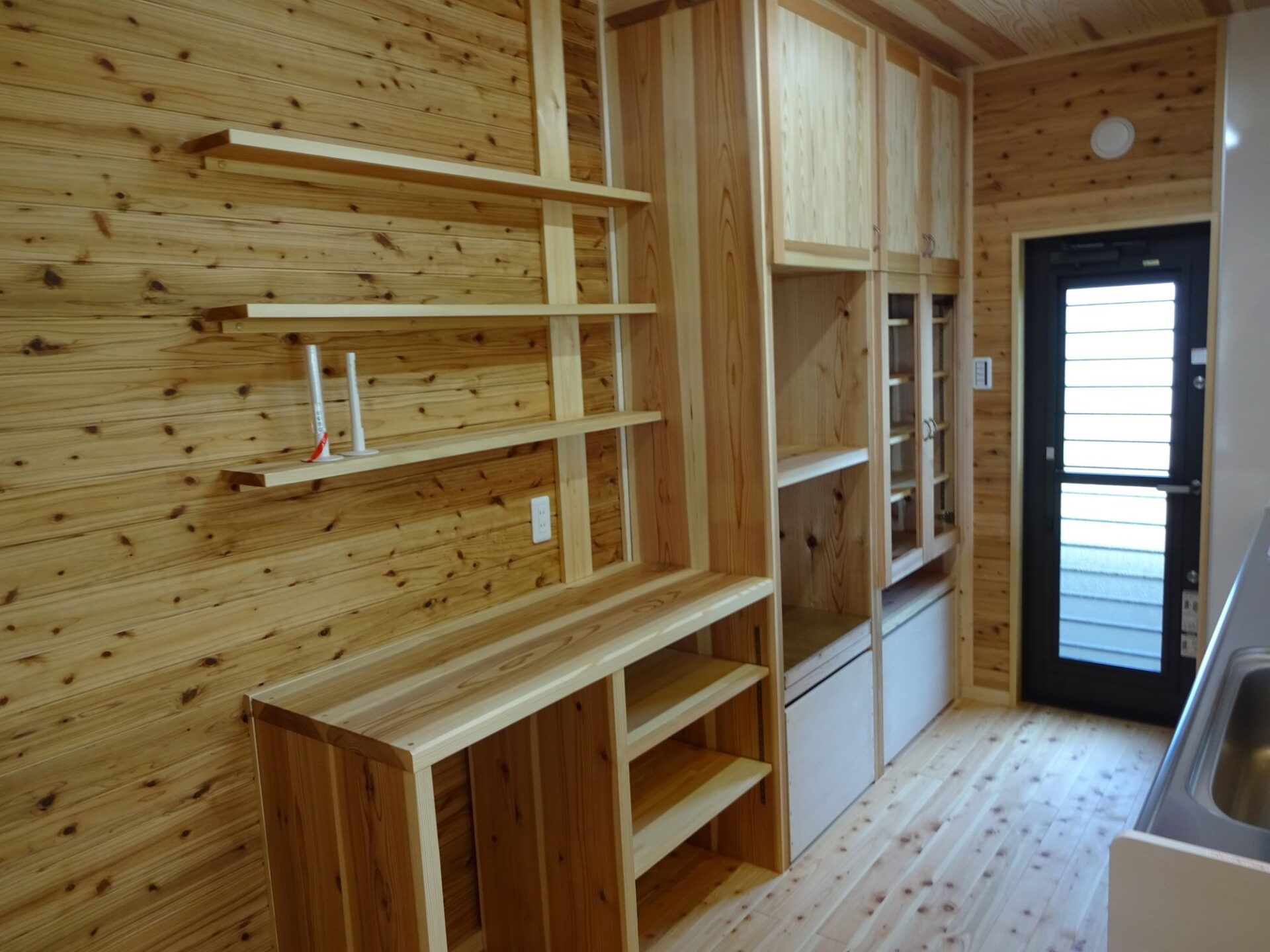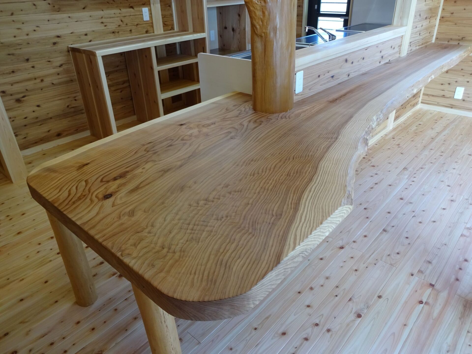 作り付けのカウンターからリビングとテラスを一望でき、繋がった空間として使えるように設計させて頂きました。 キッチンに付けさせて頂いたウッドシェルフのある木製の家電収納も、こだわりの商品です。