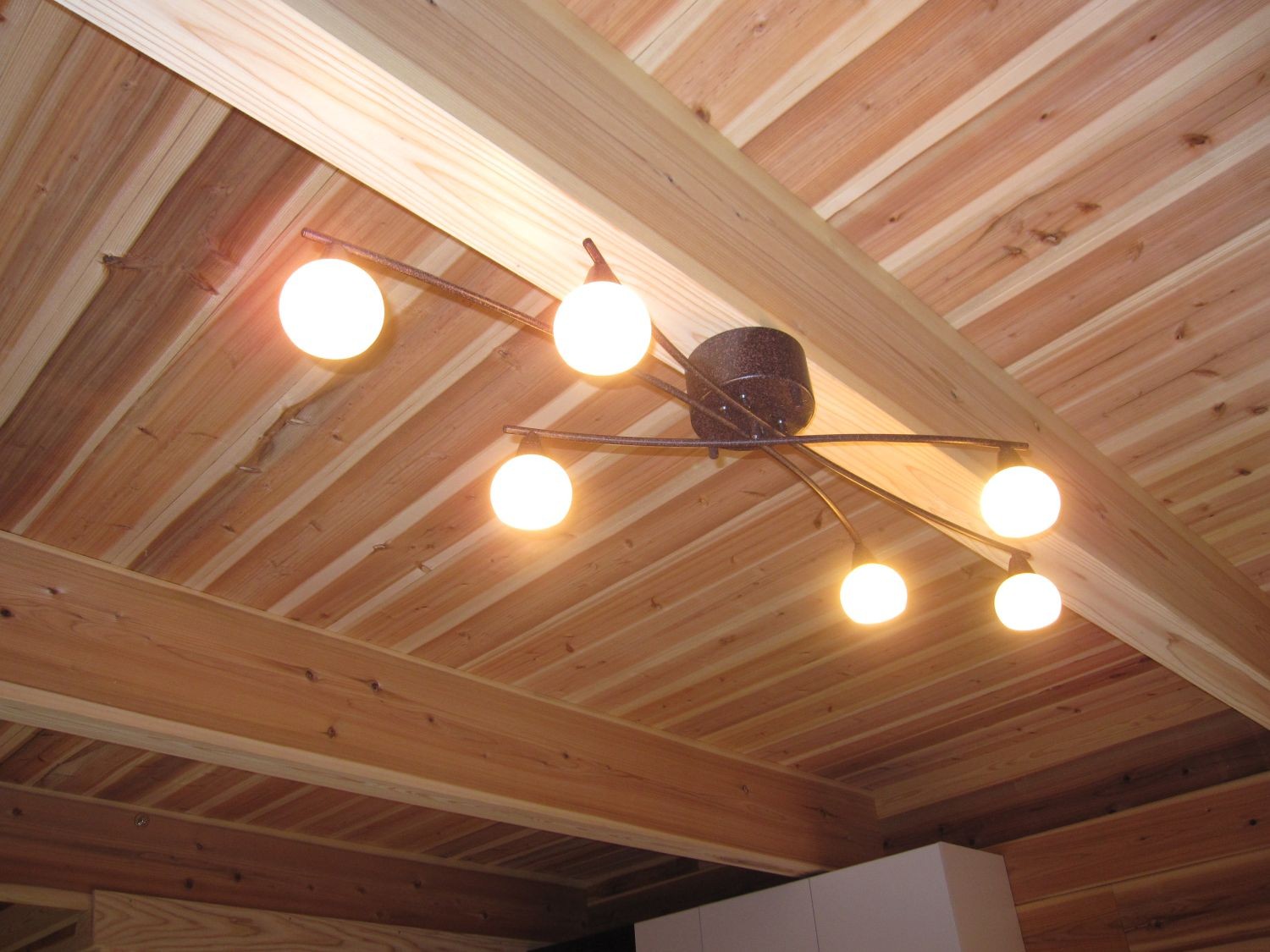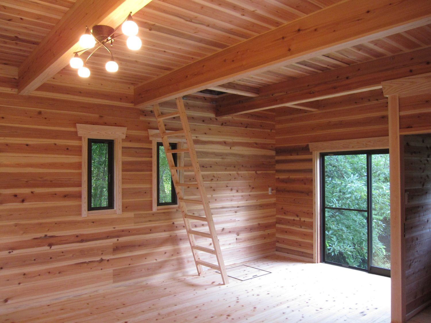 ログウォールにはw100h180の杉の無垢材を使用させて頂きました。 床には桧の無垢のフローリングを使用し天井には杉の無垢板を貼らせて頂いております。 外観はデザイン性を高めるために、窓枠と破風・鼻隠しを白に塗装しています。 小さいログハウスですが室内に入ると、心やすらぐ木の香りでいっぱいです。